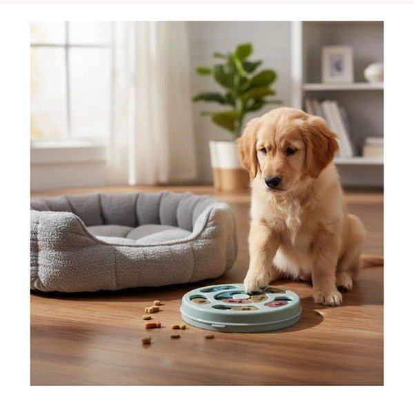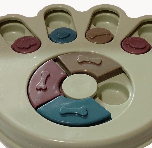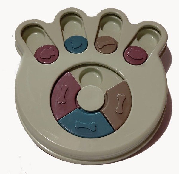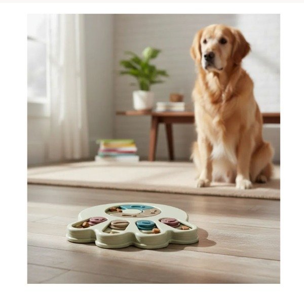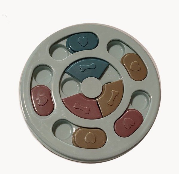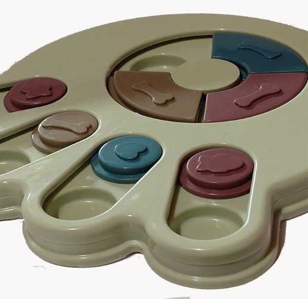 Juguete interactivo de estimulación cognitiva diseñado para promover el enriquecimiento ambiental en perros y gatos mediante la búsqueda activa de alimento o premios.